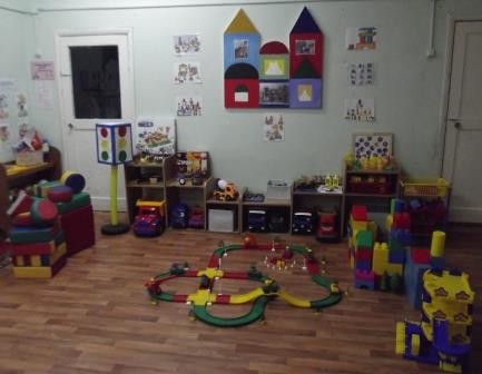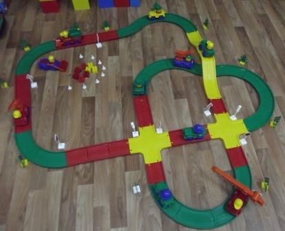 имеет свободное пространство для сооружений из крупного строительного материала. Располагается вблизи игрового уголка для того, чтобы можно было использовать постройки в играх. Крупный строительный материал расположен на низких полках, рядом с ними располагаются машины. Образцы построек меняются 1-2 раза в месяц.